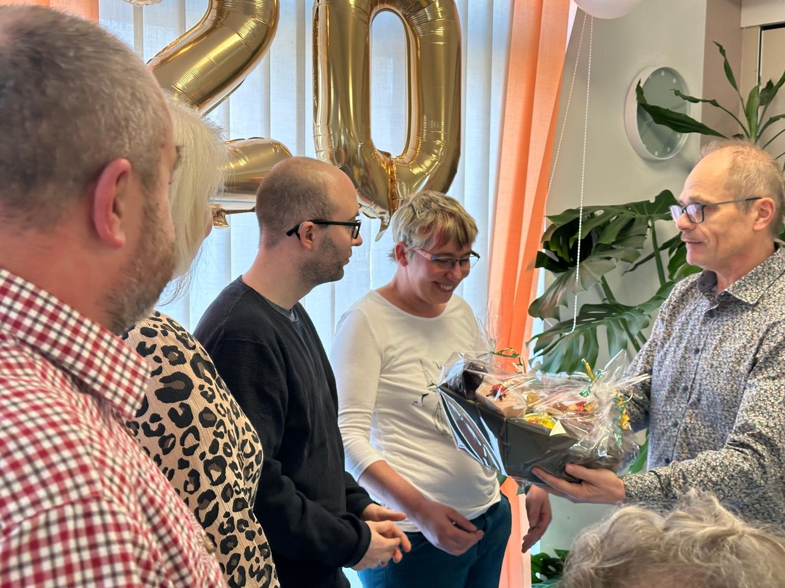 Unsere Außenwohngruppe (man sagt auch kurz AWG) im „Zebra“ gibt es jetzt seit 20 Jahren. Wir sind stolz auf dieses Zuhause. Das wurde auch gefeiert. Viele Menschen haben geholfen, das Haus zu bauen und einzurichten. Dafür sagen wir: Danke! Acht Menschen leben hier. Das Team um Frau Meißner sorgt jeden Tag dafür, dass sich alle wohlfühlen. Auch dafür: Danke! Und ein großes Dankeschön an unsere Bewohnerinnen und Bewohner sowie an ihre Familien und Betreuer. Schön, dass Sie bei uns sind und für das Vertrauen. Die letzten Jahre waren nicht immer leicht. Trotzdem haben wir gemeinsam viel geschafft – sogar zwei weitere AWGs in Auerbach. Wir freuen uns auf die nächsten gemeinsamen Jahre. Weitere Eindrücke des tollen Nachmittags zum Jubiläum auf unserer Facebook-Seite. (Foto: Lebenshilfe Auerbach, Präsent-Übergabe an die Bewohnervertretung)